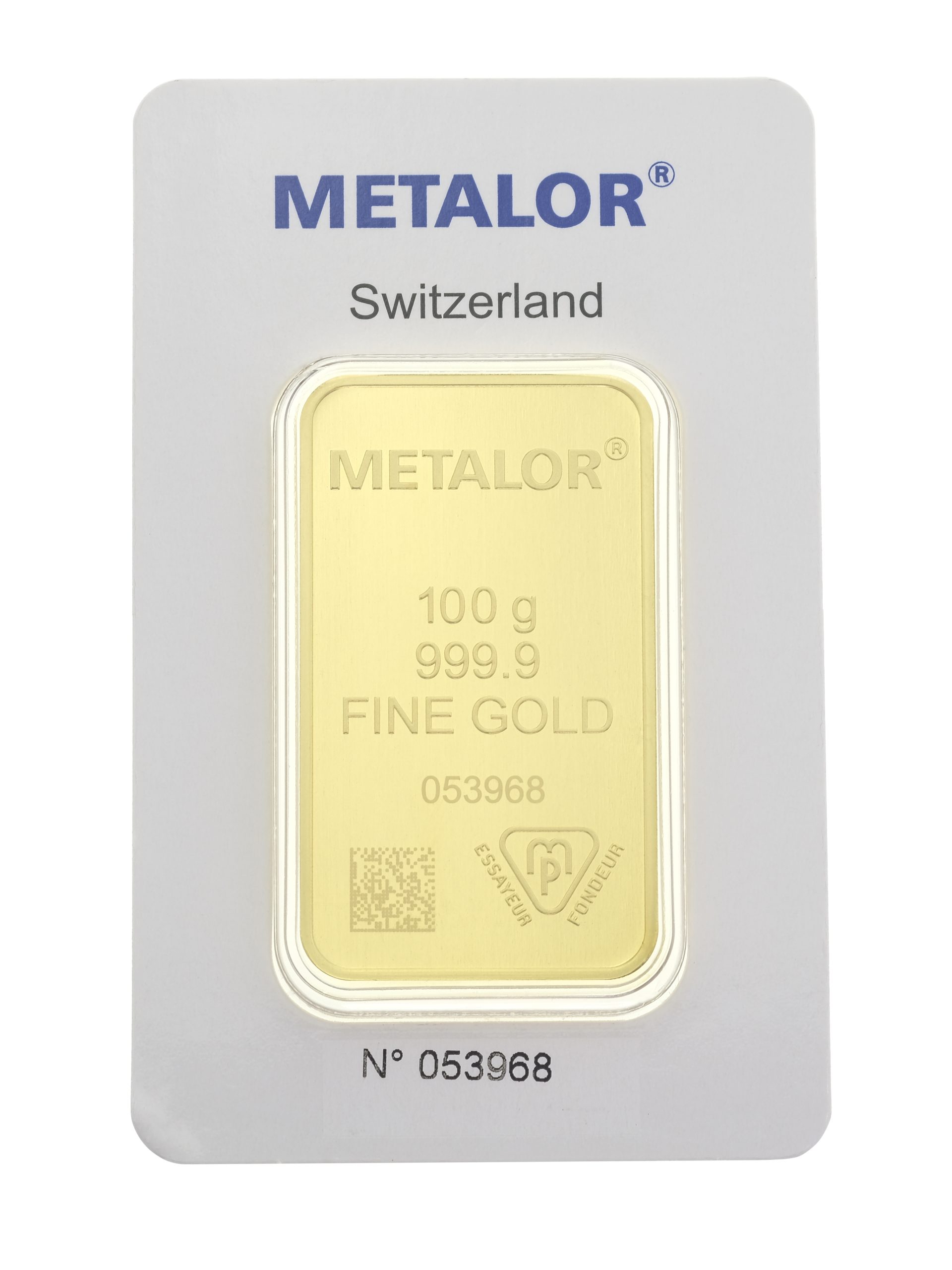 A brand new certified minted 100 Gram fine gold bar from Metalor. Each bar will be imprinted by a unique Metalor serial number and QR (quick response) code. The bar will be individually sealed in a credit card size packaging with the bar measuring 47mm X 27.5mm X 4.35mm.