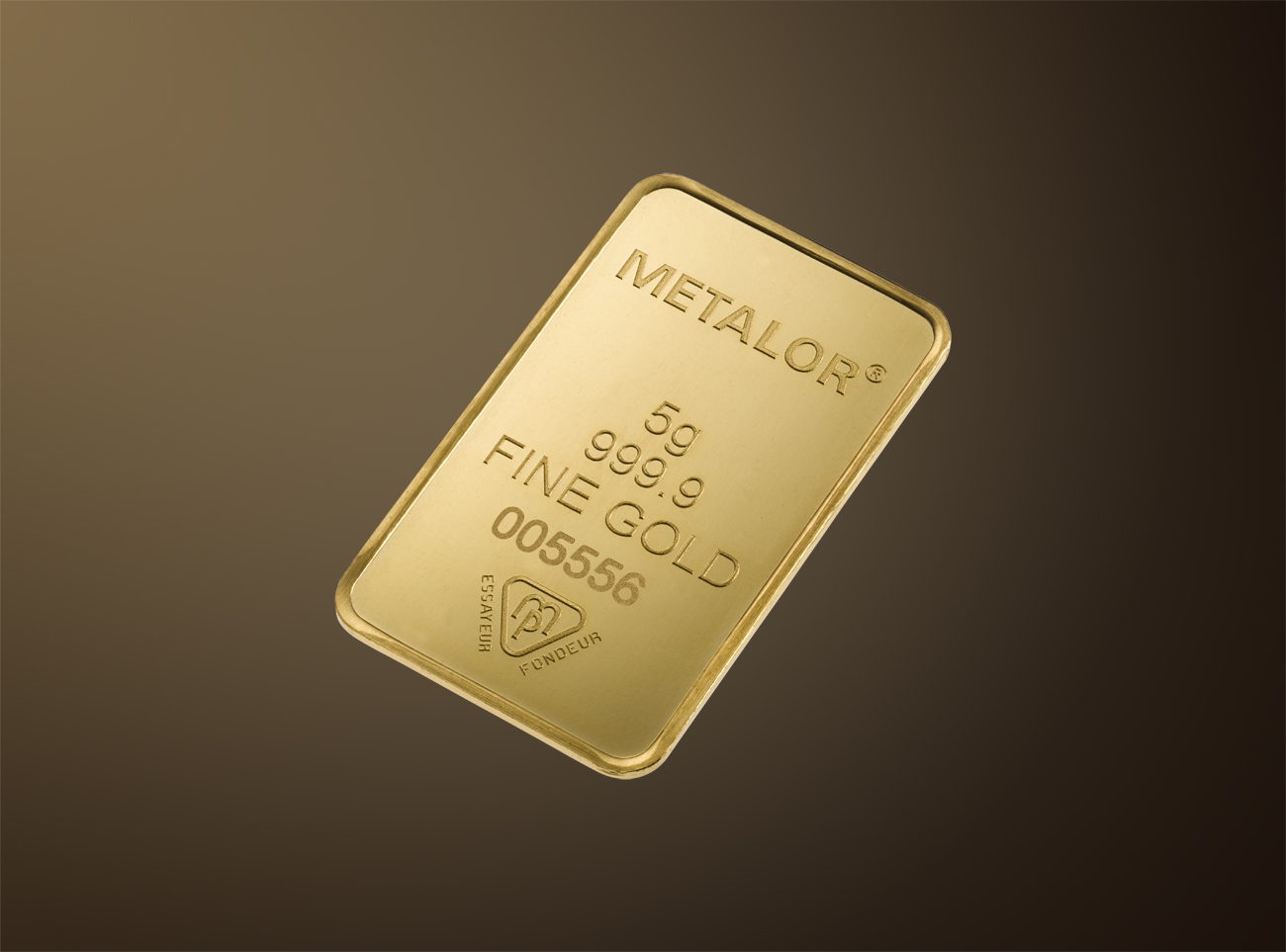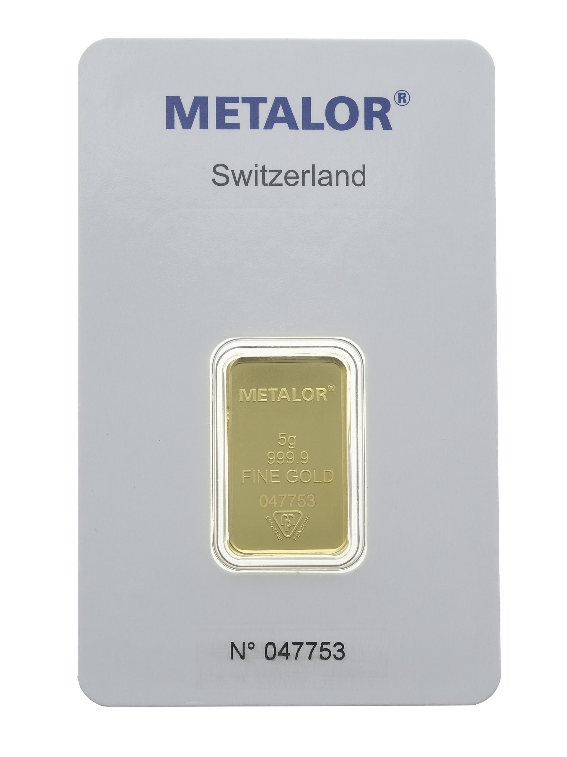 A brand new certified minted 5 Gram fine gold bar from Metalor. Each bar will be imprinted by a unique Metalor serial number and QR (quick response) code. The bar will be individually sealed in a credit card size packaging with the bar measuring 25.5mm x 15.5mm x 0.65mm.