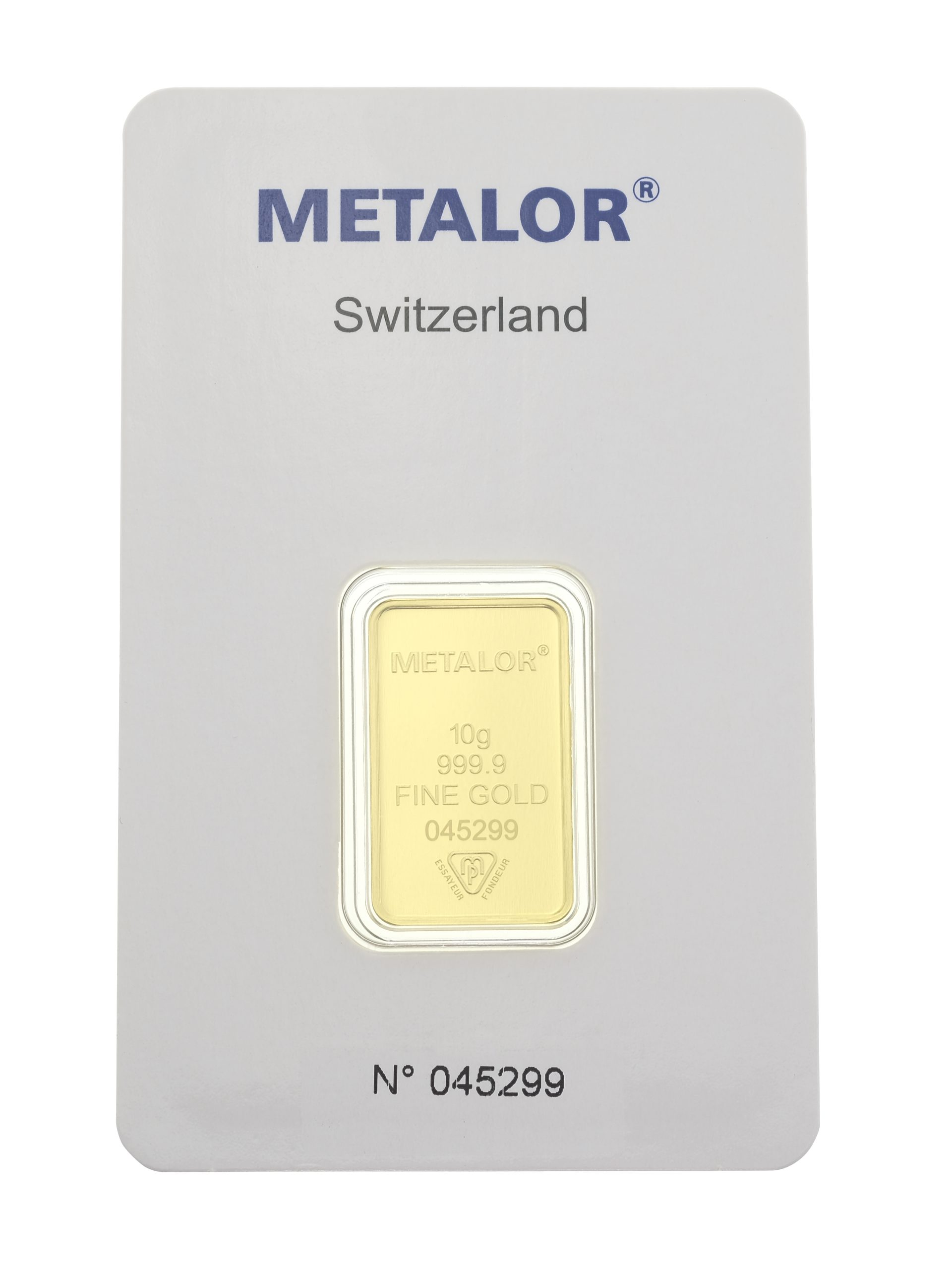 A brand new certified minted 10 gram fine gold bar from Metalor. Each bar will be imprinted with a unique Metalor serial number and QR (quick response) code. The bar will be individually sealed in a credit card size packaging with the gold bar measuring 31.5mm x 18.5mm x 1.1mm.
