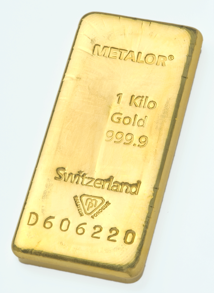 A brand new certified 1000 gram fine gold cast bar from Metalor. Each bar will be imprinted by a unique Metalor serial number.