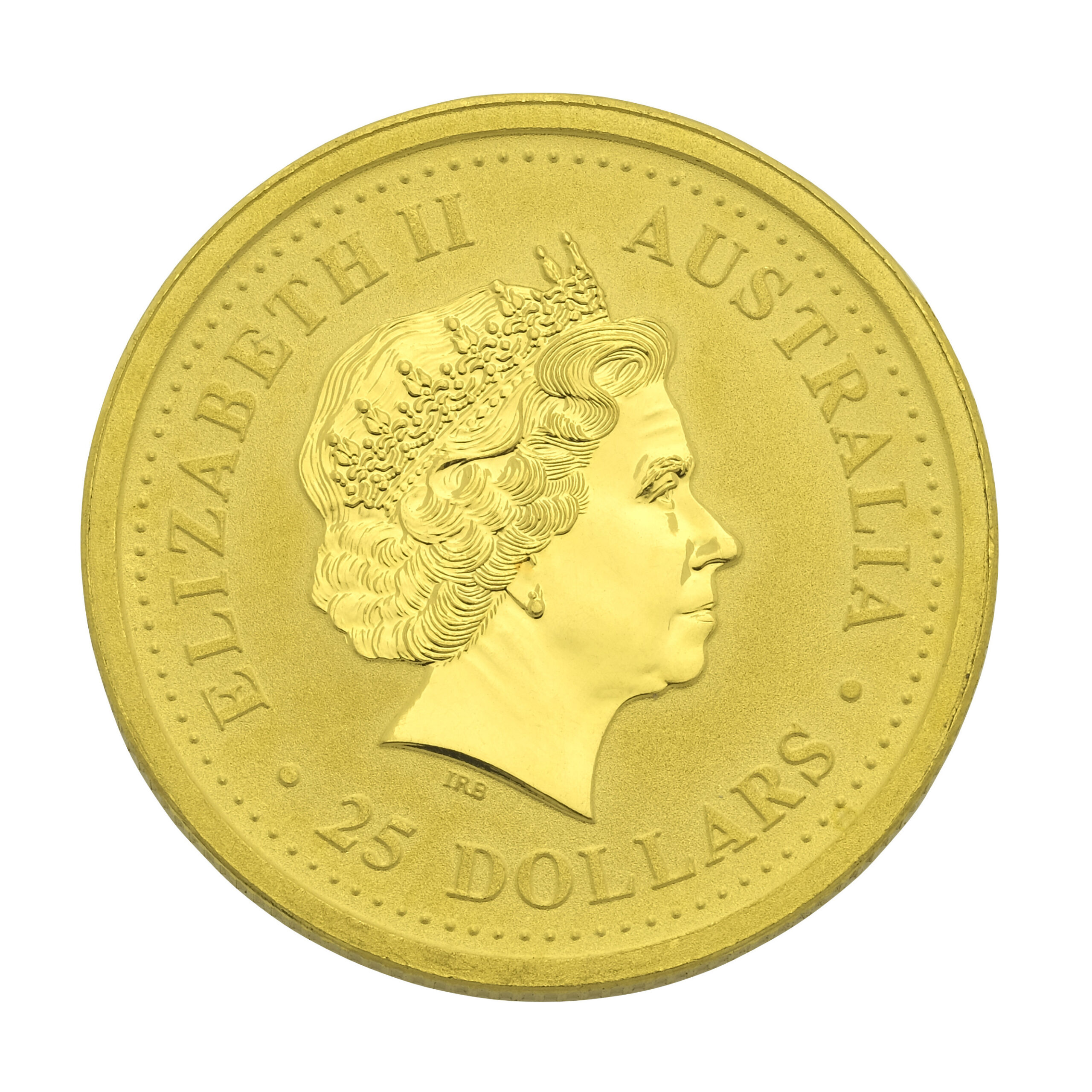 On the obverse of the Nugget coin, you will find the expertly crafted effigy of Her Majesty Queen Elizabeth II, designed by Ian Rank-Broadley. The inscriptions encircling the portrait include “ELIZABETH II,” “AUSTRALIA,” and the denomination “25 DOLLARS,” underscoring the coin’s status as official legal tender.