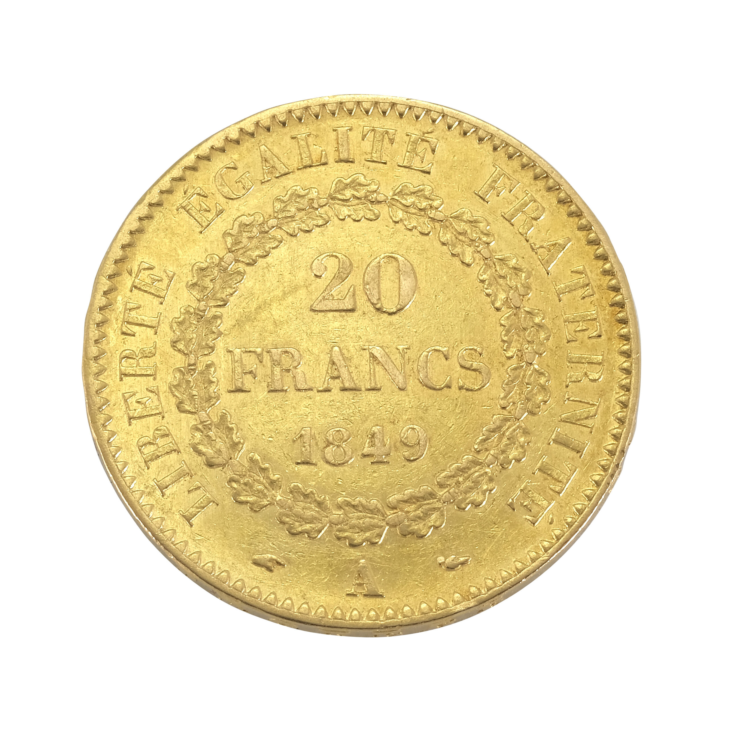 The 20 French Franc featuring the Guardian Angel Genius writing the constitution is an emblematic coin that represents a profound period in French history, emanating both beauty and historical significance. It captures a moment of constitutional importance, with the Guardian Angel Genius elegantly inscribed, tablet in hand, marking a pivotal event in the annals of French governance. The date and year meticulously etched on the tablet serve not only as a reference to the coin’s minting but also underscore a landmark moment of constitutional development in France. This imagery is steeped in symbolism, representing guidance, enlightenment, and the nurturing of democratic principles. Weighing about 6.451 grams, the coin is composed of .900 fine gold. The coin resonates with collectors and historians alike, offering a glimpse into the rich tapestry of France’s political evolution. Its scarcity and distinct design augment its value and collectibility, making it a coveted piece for enthusiasts of numismatic history and French heritage. The obverse has an “A” mark confirming it was minted in Paris.
