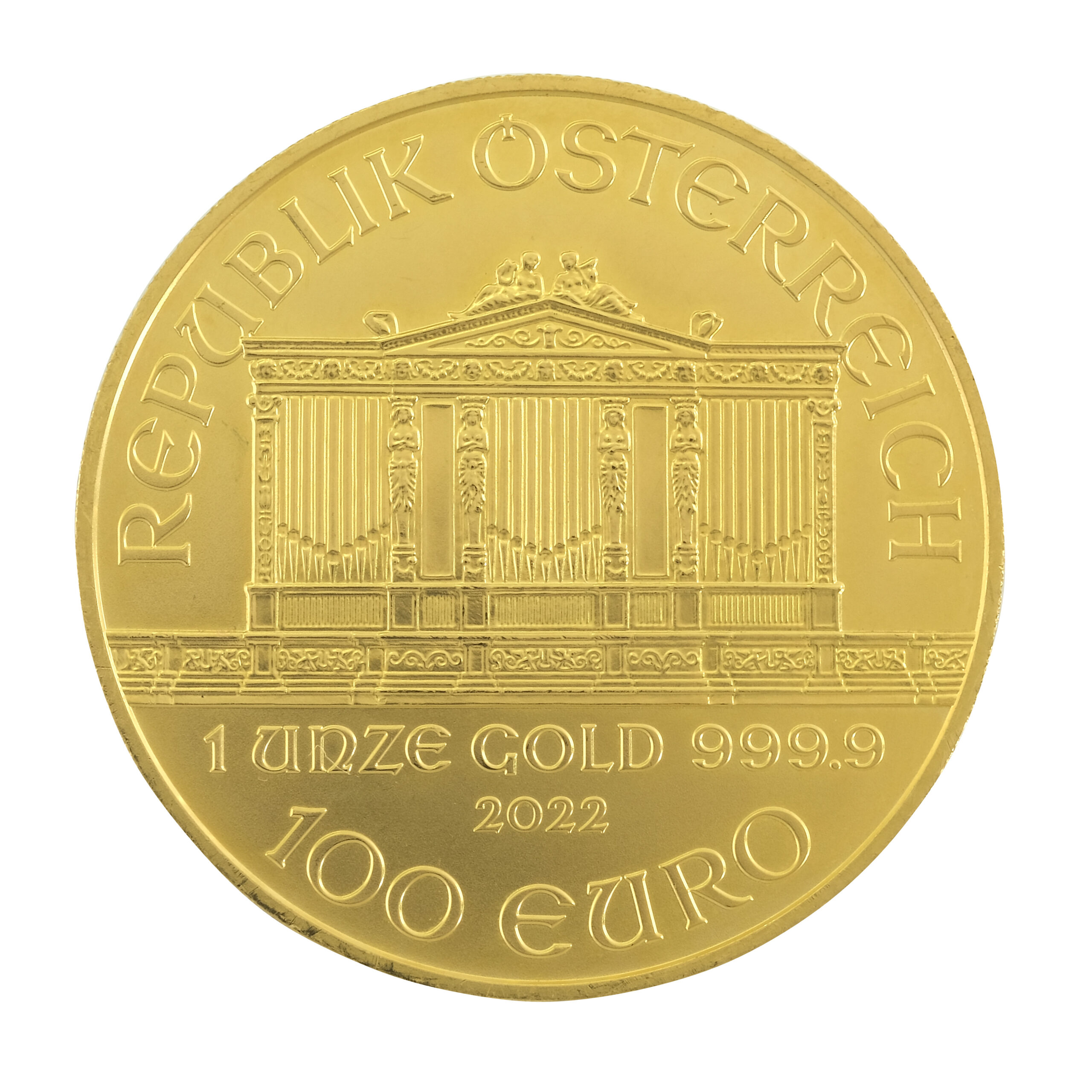 The 1oz Austrian Philharmonic coin was first issued in 1989 by the Austrian Mint and became Europe’s leading investment coin. The coin’s design pays tribute to Austria’s rich musical heritage with an array of orchestral instruments on the reverse, including a cello, violin, harp, Vienna horn, and bassoon. The obverse showcases the Great Organ of the Golden Hall in Vienna’s Musikverein, the concert hall home to the Vienna Philharmonic Orchestra. This coin is one troy ounce of pure gold (.999). You will receive a coin chosen by us from our stock, you may not specify a year.