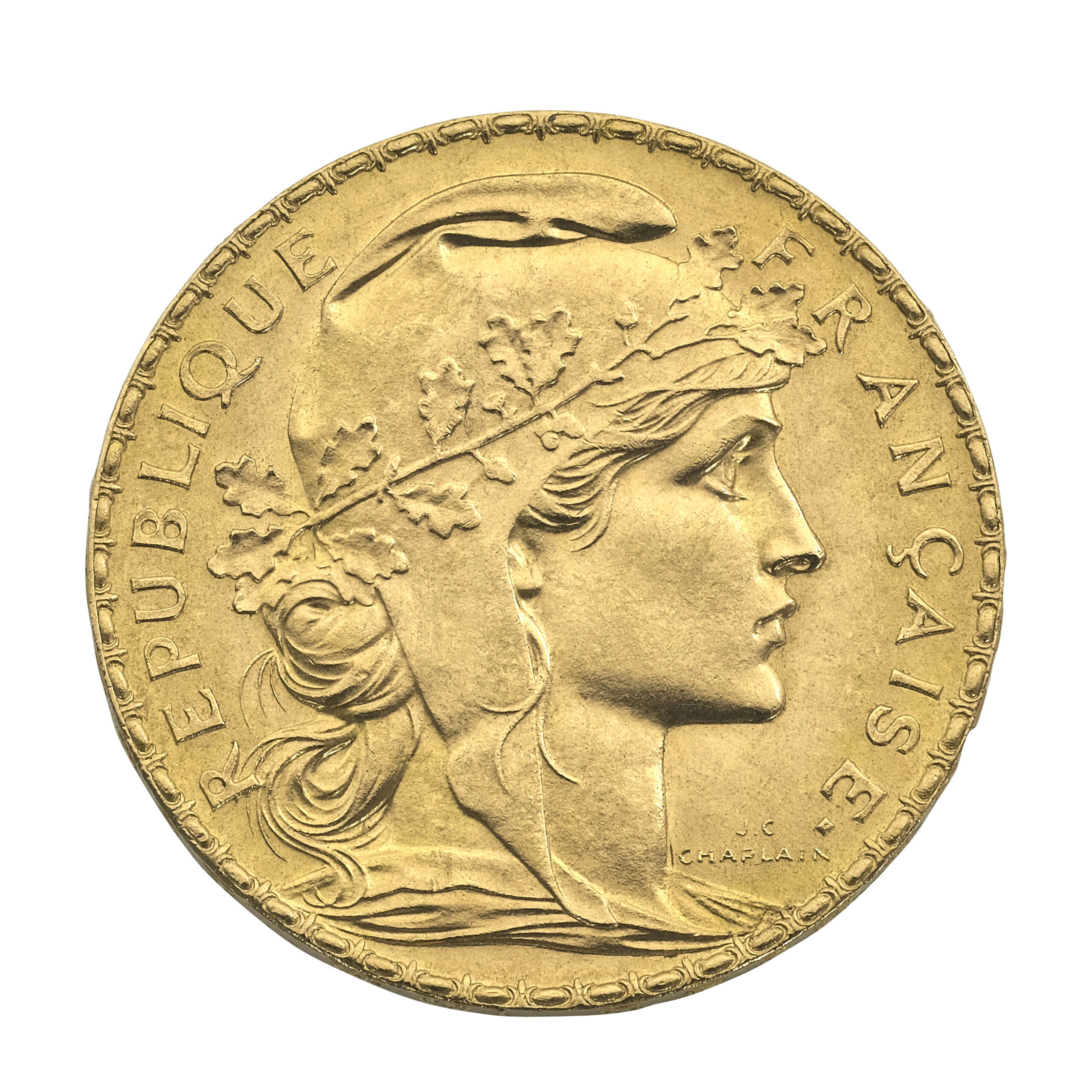 Our Best Value stock includes the 20 French Franc coin, wThe 20 Franc coin weighs 6.451 grams and contains 5.806 grams of pure gold. A French 20 Francs gold coin featuring a rooster on the reverse side and the head of Marianne on the obverse side. The text on the coin reads LIBERTE EGALITE FRATERNITE and REPUBLIC FRANCAISE. Our best value coins will be randomly selected from a variety of years.