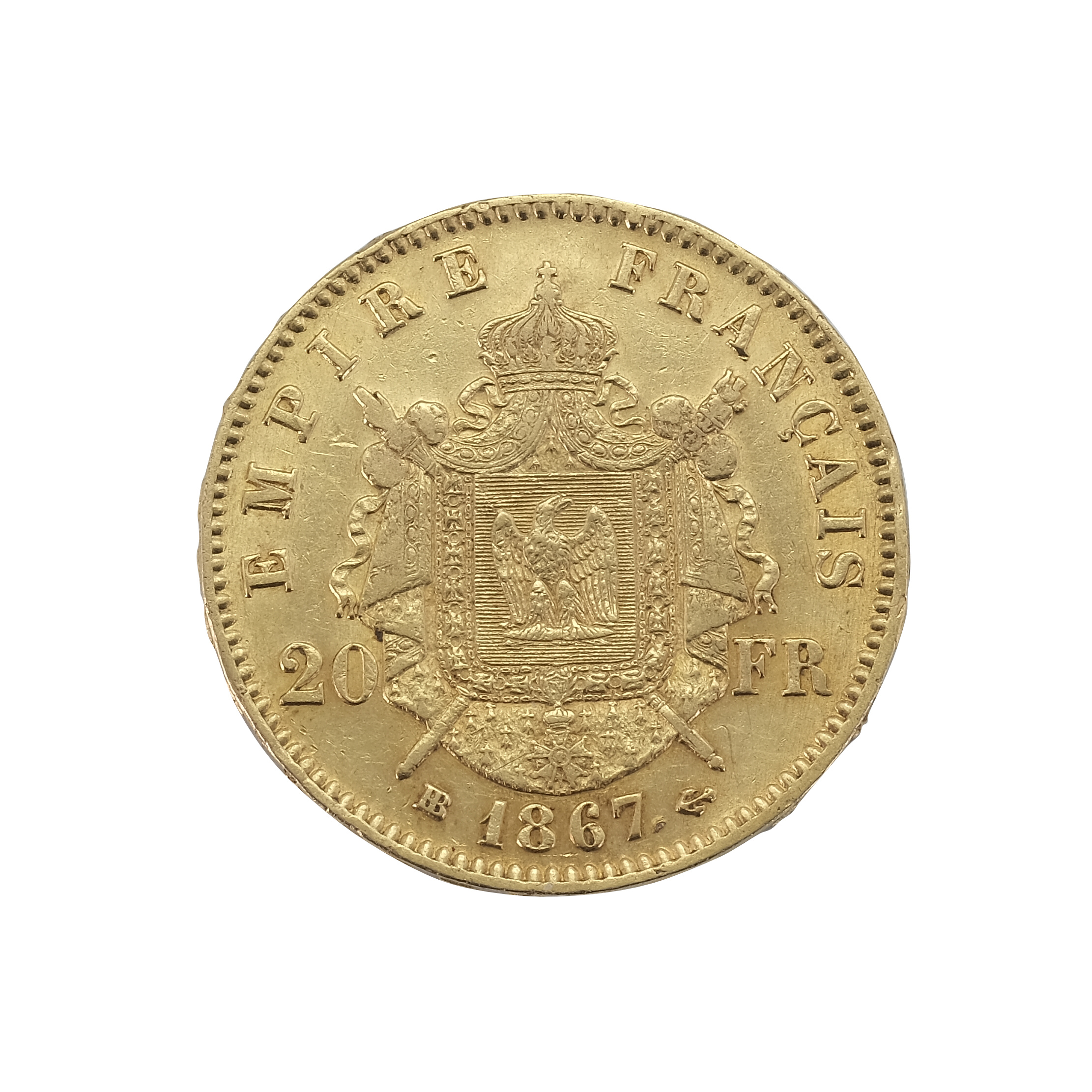 The coin features the head portrait of Napoleon III on one side and the imperial coat of arms along with the value and year on the other side. The text “NAPOLEON III EMPEREUR” and “EMPIRE FRANCAIS” is also present on the coin. The “BB” mint mark signifies that the coin was minted in Strasbourg.