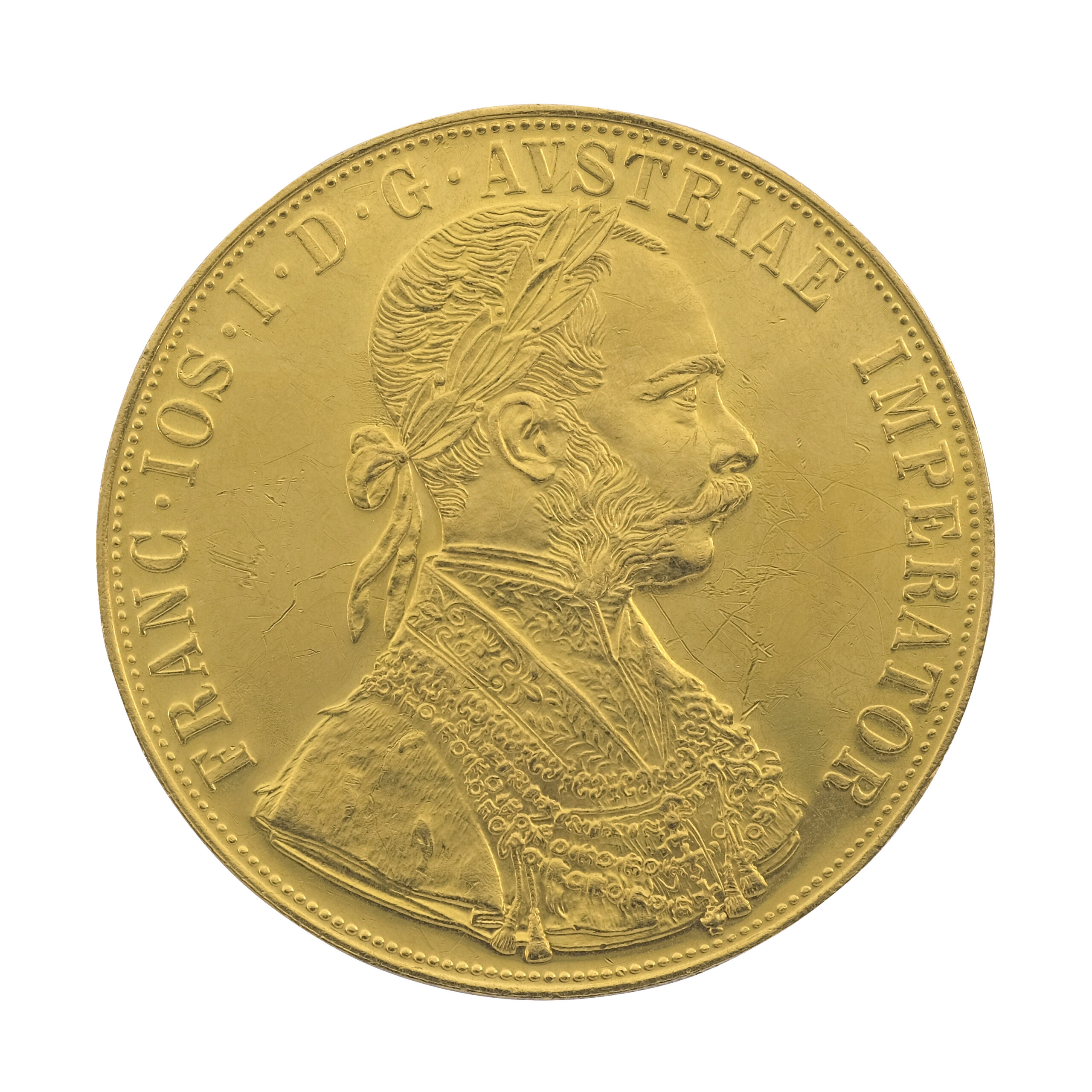 The obverse of the 4 Ducat Gold Coin Restrike from Austria features a right-facing portrait of Franz Joseph I, emperor of Austria-Hungary, surrounded by a Latin legend. The reverse showcases the Hapsburg coat of arms, a double-headed Imperial Eagle with a shield on its chest, the Chain of the Order of the Golden Fleece, and the crown of the Austrian Empire. The inscriptions on the reverse translate to “Archduke of Austria, Duke of Burgundy, Count of Tyrol,” indicating the emperor’s various titles. Struck by The Austrian Mint, this coin is a popular choice among numismatists and investors for its historical significance and high gold content.