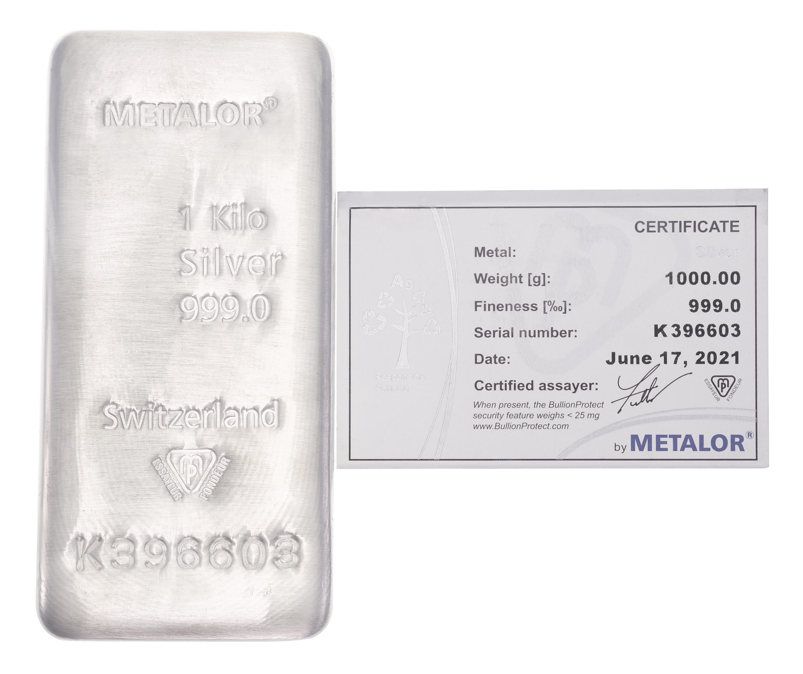A brand new certified 1000 Gram 999.0 fine silver cast bar from Metalor. Each bar will be imprinted by a unique Metalor serial number.
